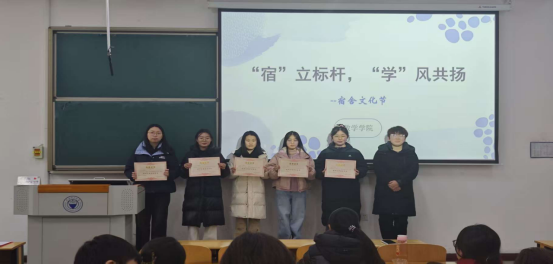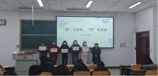 颁奖环节,20-203、20-208、20-207、10-825、10-827宿舍凭借浓厚的学习氛围和扎实的学风建设成果获“学风文化最优宿舍”的称号;10-818、10-819、10-824、20-201、20-205宿舍因和谐的宿舍关系、积极的文明风貌获“精神文明最优宿舍”的荣誉。获奖宿舍代表上台领奖时,台下掌声雷动,现场洋溢着喜悦与自豪的氛围。