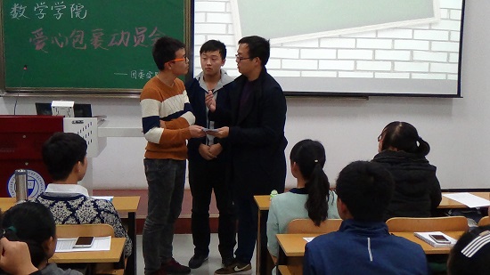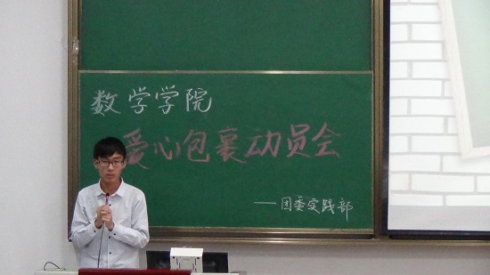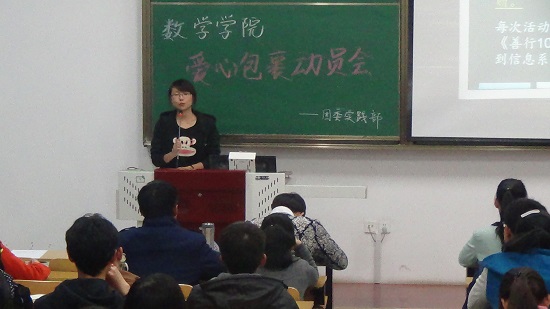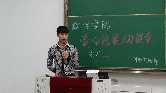 2015年10月27日,我院团委实践部在明向校区行远楼A104召开了爱心包裹动员会,团委副书记郭杰出席了本次会议。此次会议旨在使我院青阅志愿者服务队队员深入了解“爱心包裹”活动,能够充满热情地投入到每一次劝募活动中,为贫困儿童贡献出自己的力量,创造更大的价值。