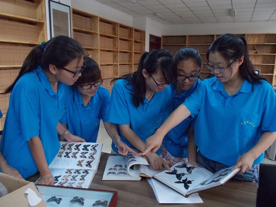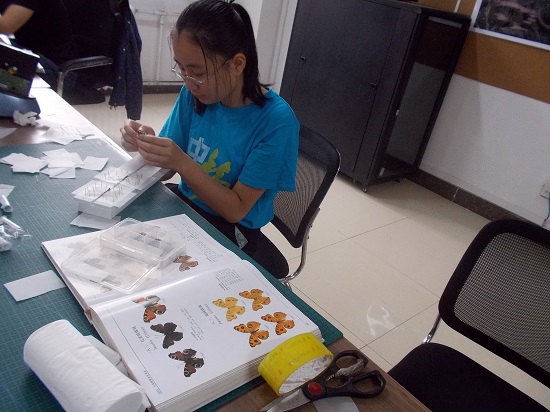 上午,沃成生态研究所的工作人员向同学们展示了漂亮的蝴蝶标本和标本制作过程,并耐心地教授队员们如何做回软蝴蝶的展翅工作。队员们抱着强大的好奇心和求知欲学习了蝴蝶标本的制作过程。听讲过程认真细致,虚心请教,得到研究所工作人员的赞扬和好评。下午,在老师的指导下,分到标本制作组的两名队员开始动手制作回软蝴蝶的展翅。经过练习,两位女同学很快掌握制作技巧,在短短几小时过程中制作完整美丽的蝴蝶标本。