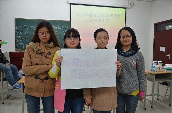 2014年11月9日,我院统计1302班开展“我为社会主义核心价值观代言”主题知识竞赛活动。本次竞赛活动分为填空题、选择题、简答题和游戏四个环节。全体成员分成五支队伍,神采奕奕,气氛活跃,在答题过程中进一步了解了社会主义核心价值观主要内容和精神,充分认识了中国特色社会主义理论体系的重大意义。本次活动切实增强了全体学生与时俱进的能力,全面加强班级学风和团风建设,加深了同学之间的情谊。