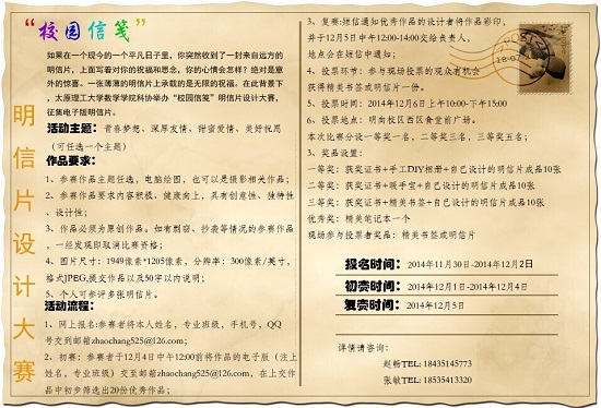 参赛者于12月4日中午12:00之前将电子版作品(注明姓名、专业班级)发至同一邮箱~欢迎大家前来报名投稿,优秀作品将获得DIY相册,暖手宝,以及自己设计作品的成品10份哦!现场投票的筒子们将会获得明信片与精美书签哦~还等什么,快来参加吧!