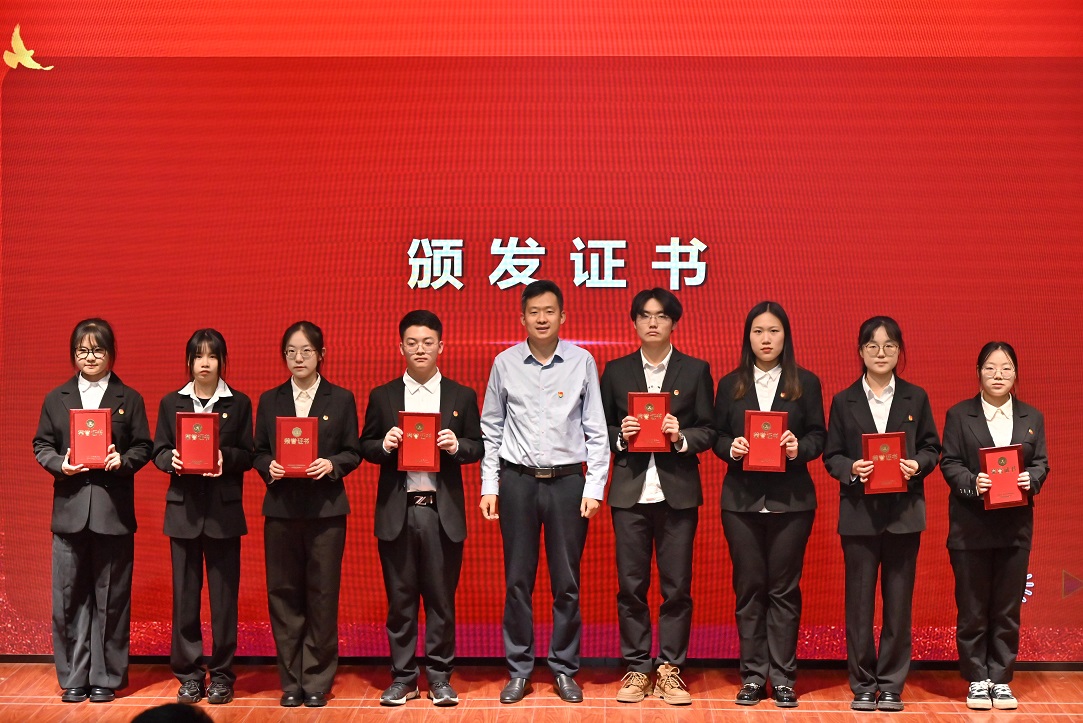 接着,举行了新发展团员入团仪式,杨卫华为新团员颁发并佩戴团徽。新发展团员面向团旗进行了庄严的入团宣誓。宣誓后,赵芦冉代表全体新团员郑重承诺,今后将牢记入团誓词,时刻铭记团的宗旨与使命,争做“五个模范”好青年。