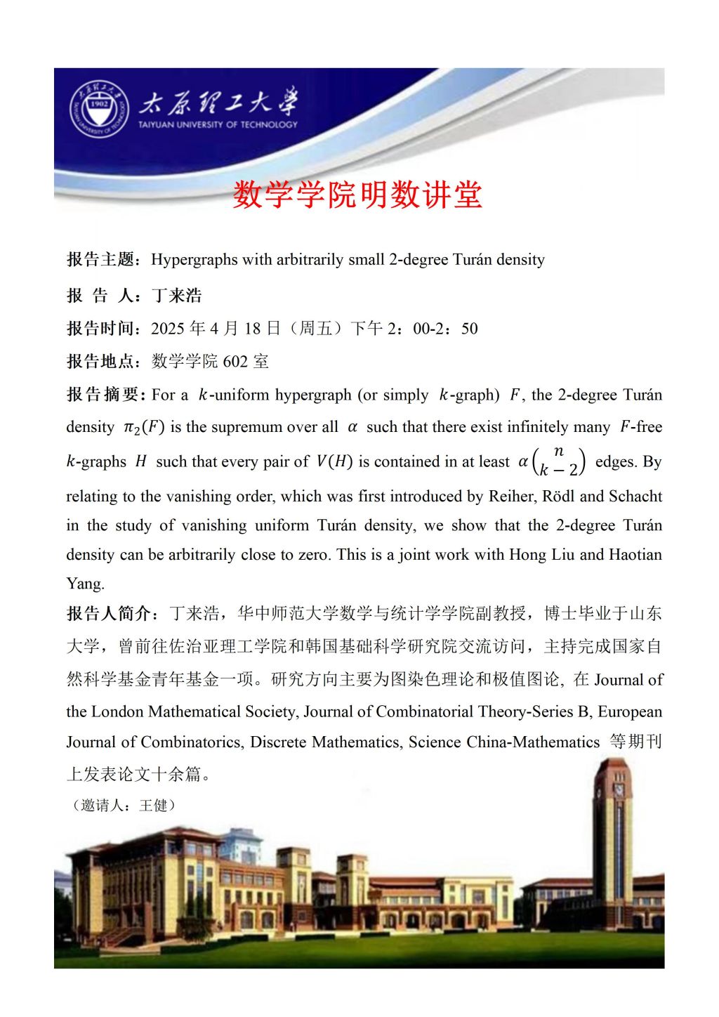 报告人简介:丁来浩,华中师范大学数学与统计学学院副教授,博士毕业于山东大学,曾前往佐治亚理工学院和韩国基础科学研究院交流访问,主持完成国家自然科学基金青年基金一项。研究方向主要为图染色理论和极值图论, 在Journal of the London Mathematical Society, Journal of Combinatorial Theory-Series B, European Journal of Combinatorics, Discrete Mathematics, Science China-Mathematics 等期刊上发表论文十余篇。