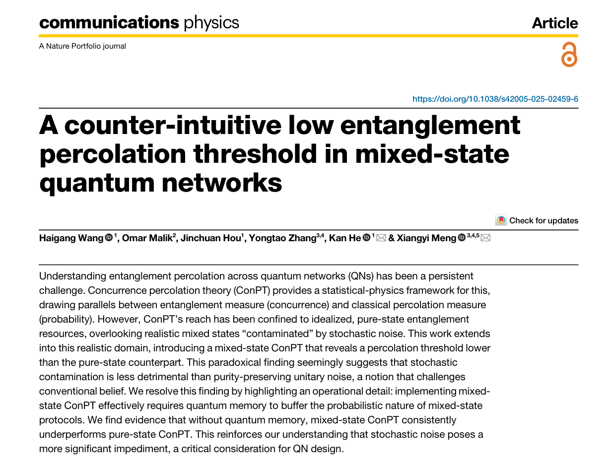 近日,我校yl6809永利集团的算子理论与量子信息团队应用算子理论和统计学等数学工具,在量子信息与统计物理领域中的纠缠渗流问题上取得研究进展。该研究工作以题为“A Counter-Intuitive Low Entanglement Percolation Threshold in Mixed-State Quantum Networks”的学术论文发表在期刊《Communications Physics》上。该论文的第一署名单位为yl6809永利集团,第一作者是我校博士生王海港,合作者包括侯晋川教授,Omar Malik博士和张勇涛博士,通讯作者为贺衎和美国伦斯勒理工学院孟祥一。