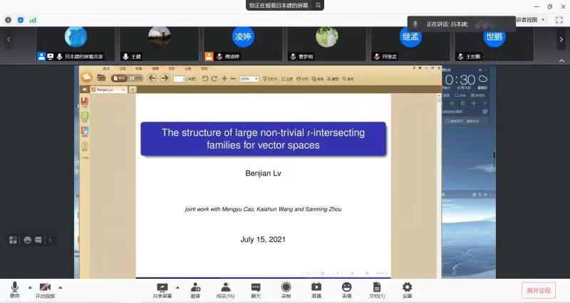 7月15日上午,北京师范大学吕本建副教授应邀为我院师生作题为“The structure of large non-trivialt-intersecting families for vector spaces”的线上报告(腾讯会议形式)。报告由数学系王健主持,我院图论方向的教师与研究生参加了报告会。