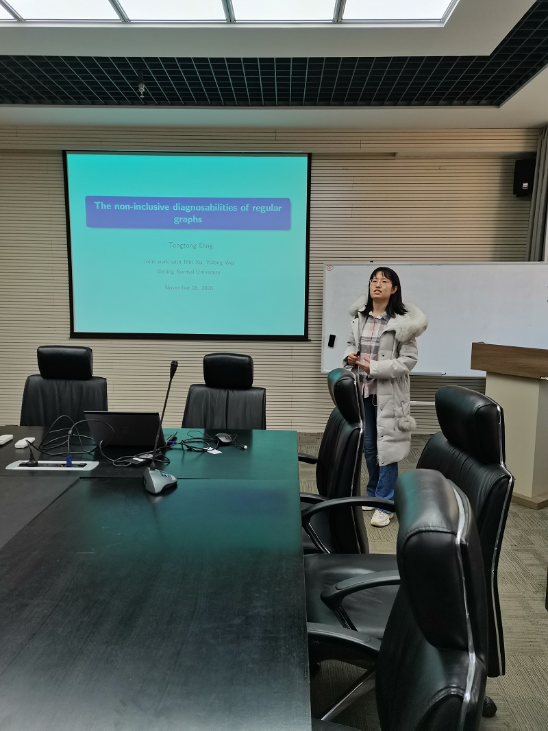 报告人简介:丁曈曈,现为北京师范大学数学科学学院2020级博士研究生,博导为徐敏教授,侧重于网络容错诊断的研究。目前发表SCI两篇。