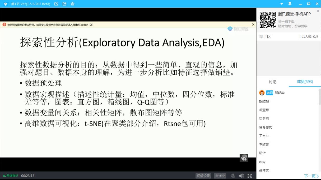 邓明华教授首先对数据预处理与数据分析方面进行讲解,强调数据预处理的重要性。接下来根据不同的实际问题背景和数据处理需求,分别详细介绍了数据降维方法、聚类分析、分类方法、相关分析以及回归分析,从理论含义到实际应用都进行细致讲解。讲解过程结合最新研究前沿和历年竞赛真题,这让参赛学生对统计学方法从理论到应用都有了清晰的认识,也为学生在统计建模方法学习方面指明了主要学习方向、提供了应用方法。课后邓教授针对大家提出的数据缺失值处理等相关理论问题进行了详细解答。
