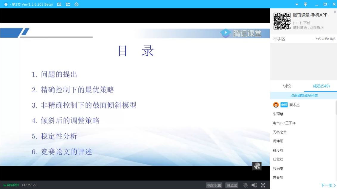 蔡志杰教授首先对19年国赛B题的问题提出和结题思路进行总体介绍,然后根据结题思路从四个方面进行深入解析,包括:精确控制下的最优策略、非精确控制下的鼓面倾斜模型、倾斜后的策略调整以及稳定性分析,最后详细讲解了竞赛论文评述方面的一些重点问题和注意事项。通过对这道赛题的细致分析,让学生真实体会到了什么样的论文是一篇优秀的建模论文,什么是好的建模思路和最优的解题方法,也感受到了自身的不足,明确了赛前学习和准备的方向。课后蔡教授详细解答了大家提出的各类问题。