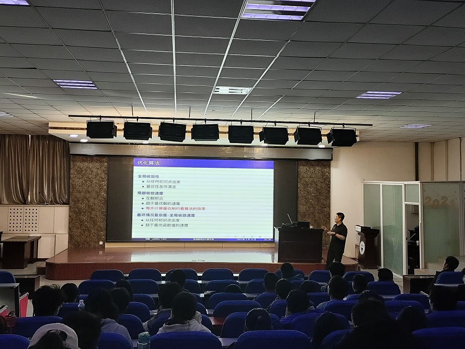 刘歆首先从“什么是运筹学”“什么是计算科学”等问题入手,深入浅出地介绍了最优化计算方法的基础知识,随后聚焦分布式计算、在线优化等前沿领域,以通俗易懂的语言讲解了优化算法、无约束优化、约束优化、无导数优化等各种计算方法;针对大数据与人工智能,刘歆结合现代科技,立足当下,详细讲解了压缩感知的流程,之后以每个人的淘宝、京东推荐页面不同引出推荐系统,基于今年热门电影的观众选择度,引出矩阵完整化数学描述。讲解过程中不时穿插具体生动的例子,帮助大家更好地理解在材料计算、大数据分析与机器学习等领域中常用的各类最优化模型。讲解结束,在场师生与刘歆就相关问题进行深入交流,现场气氛热烈。