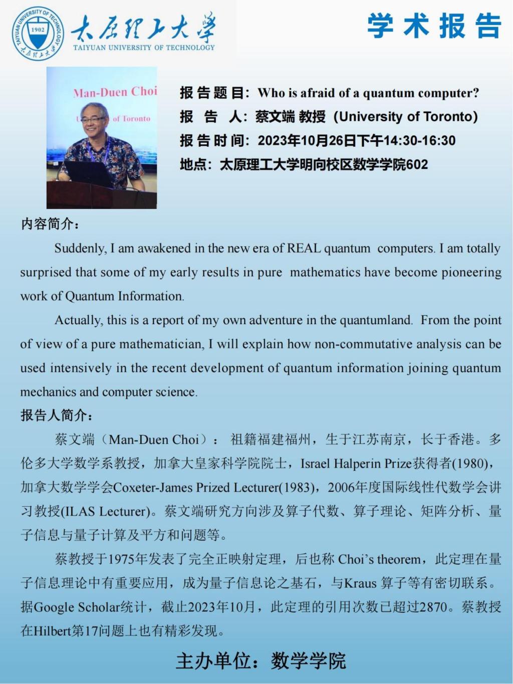 蔡文端(Man-Duen Choi): 祖籍福建福州,生于江苏南京,长于香港。多伦多大学数学系教授,加拿大皇家科学院院士,Israel Halperin Prize 获得者(1980),加拿大数学学会 Coxeter-James Prized Lecturer(1983),2006 年度国际线性代数学会讲习教授(ILAS Lecturer)。蔡文端研究方向涉及算子代数、算子理论、矩阵分析、量子信息与量子计算及平方和问题等。