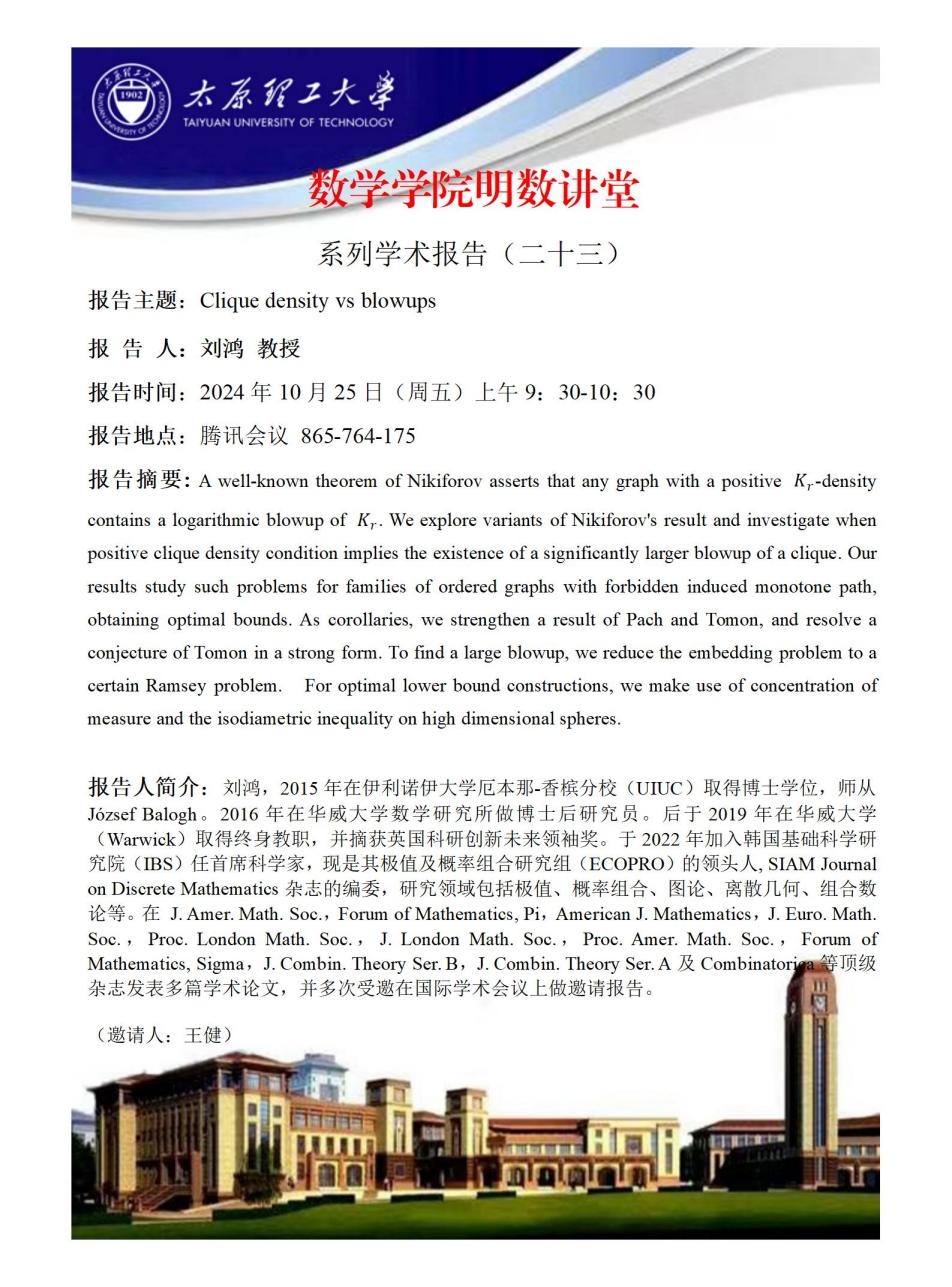 报告人简介:刘鸿,2015年在伊利诺伊大学厄本那-香槟分校(UIUC)取得博士学位,师从József Balogh。2016年在华威大学数学研究所做博士后研究员。后于2019年在华威大学(Warwick)取得终身教职,并摘获英国科研创新未来领袖奖。于2022年加入韩国基础科学研究院(IBS)任首席科学家,现是其极值及概率组合研究组(ECOPRO)的领头人, SIAM Journal on Discrete Mathematics杂志的编委,研究领域包括极值、概率组合、图论、离散几何、组合数论等。在 J. Amer. Math. Soc.,Forum of Mathematics, Pi,American J. Mathematics,J. Euro. Math. Soc.,Proc. London Math. Soc.,J. London Math. Soc.,Proc. Amer. Math. Soc.,Forum of Mathematics, Sigma,J. Combin. Theory Ser. B,J. Combin. Theory Ser. A及Combinatorica等顶级杂志发表多篇学术论文,并多次受邀在国际学术会议上做邀请报告。