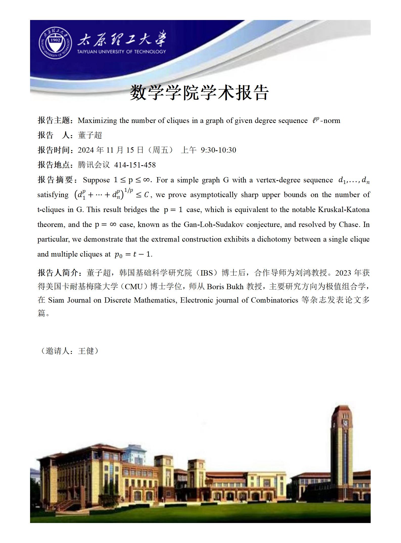 报告主题:Maximizing the number of cliques in a graph of given degree sequence $\ell^p$-norm