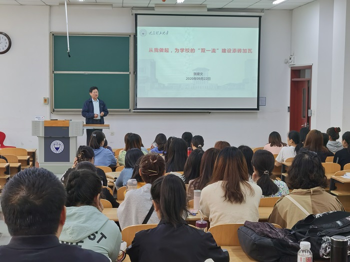 张建文以“从我做起,为学校‘双一流’建设添砖加瓦”为题,介绍了我校及我院的发展过程,特别强调了学院在“双一流”建设中的历史机遇和历史使命,并为学生提出了24字殷切建议,希望研究生们能够“认识自己,确定目标,制定规划,完善措施,持续改进,持之以恒”。