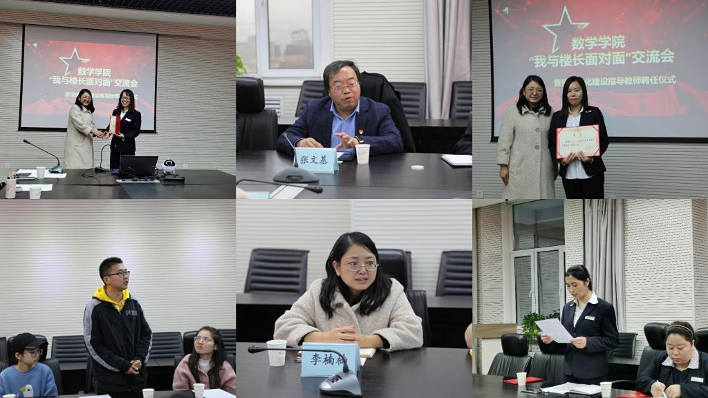 为助力学生宿舍建设,加强公寓与同学们的沟通交流,11月20日下午,我院在数学楼602办公室举办“我与楼长面对面”交流会暨宿舍文化建设指导教师聘任仪式。公寓服务中心主任张文基、我院党委副书记李楠楠、团委书记冯妍、公寓中心助理梁青华、本科生各楼长代表,以及各年级辅导员和学生代表参加此次活动。