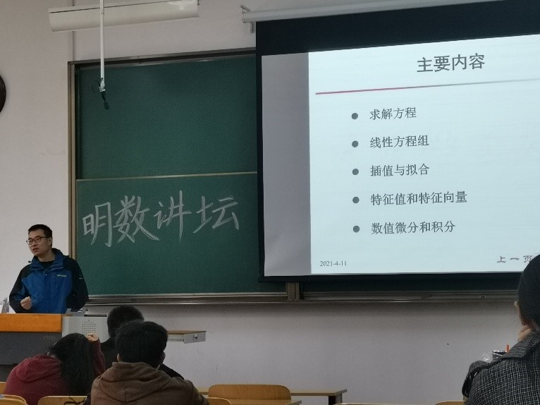 2021年4月11日下午2点,我院科技创新中心、数学建模协会在行知楼B113举办“数值计算相关内容详解”为主题的明数讲坛系列讲座。本活动有幸邀请到我院教师闫玉龙作为主讲人,为同学们讲解数值计算相关内容。