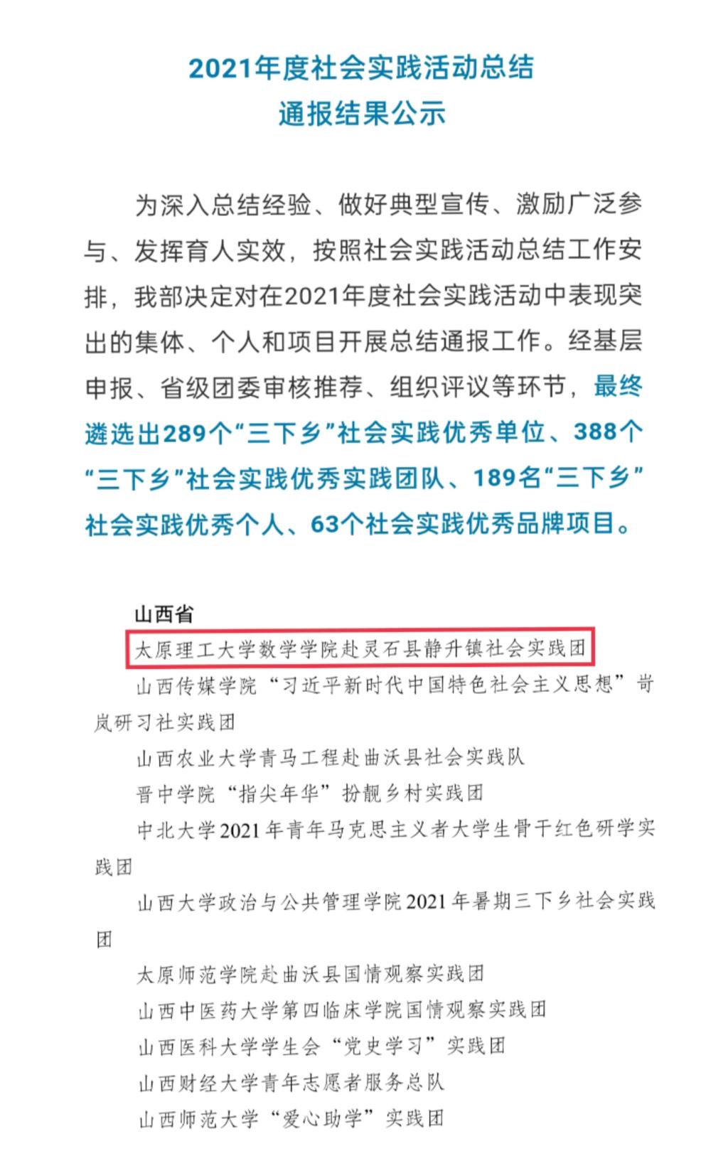 团中央青年发展部对在2021年度社会实践活动中表现突出的集体、个人和项目开展总结通报工作。经基层申报、省级团委审核推荐、组织评议等环节,最终遴选出289个“三下乡”社会实践优秀单位、388个“三下乡”社会实践优秀实践团队、189名“三下乡”社会实践优秀个人、63个社会实践优秀品牌项目。