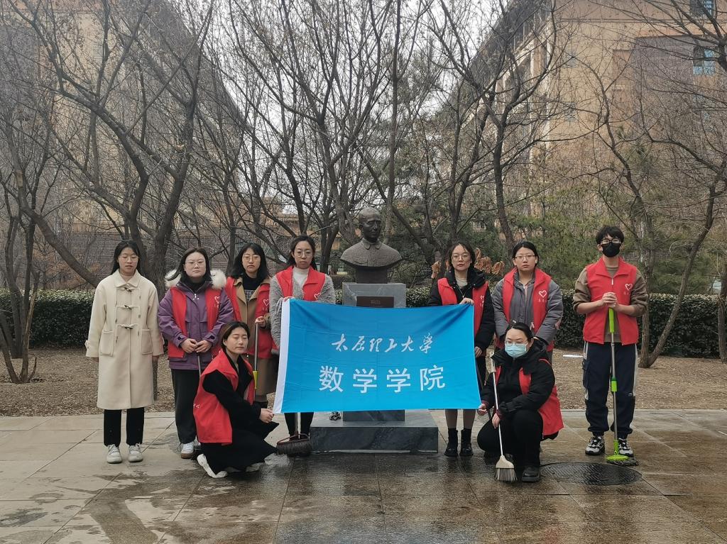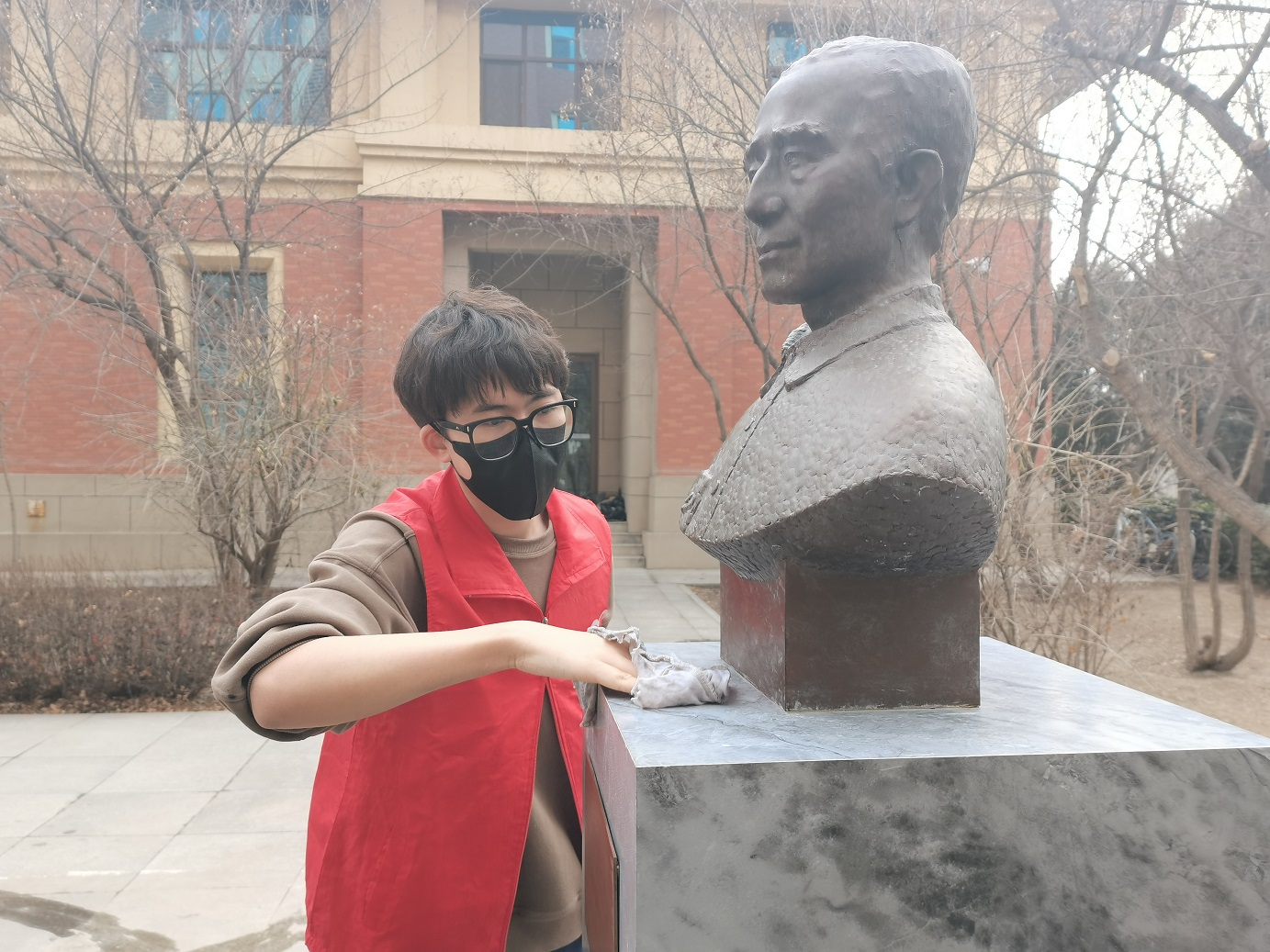 常师贞老先生是我校数学学科创始人和奠基人。在校工作期间,他建立教研室,创办“工程数学专业”,作为导师招收我校第一个数学专业研究生……一生致力于数学学科的发展,是一位德高望重的老师,深受尊敬和爱戴。清洁铜像,缅怀先生的光辉业绩和高尚品行。活动当天,同学们拿好工具到指定地点开始清扫。同学们分工有序、相互配合,不放过任何一个角落:清扫了铜像周围的垃圾和落叶,清洁了地面土渍,并对铜像的各个角落进行了细致的擦拭。刺骨的寒风抵不过同学们的热情,没过多久,铜像周围便焕然一新。最后,同学们把路障摆好并合影留念。同学们望着擦拭过后的铜像,回想着先生生平的光辉事迹和高尚品行,心中的敬仰之情油然而生,纷纷表示要不断继承和发扬常师贞先生等老一辈数学人的精神。