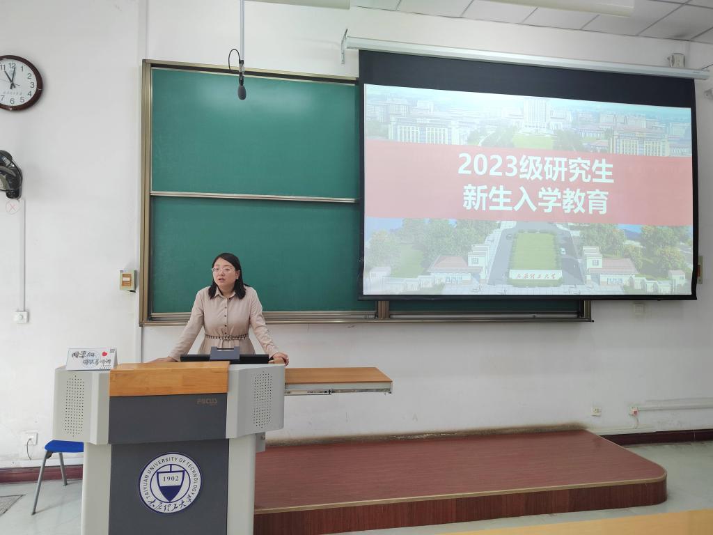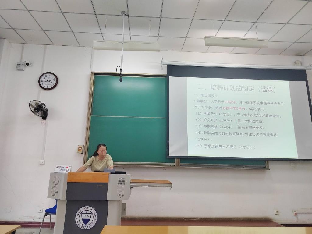 李楠楠简要介绍学校、学院的历史沿革和学科建设的发展方向,且就学院组织架构、研究生教育的相关政策等进行了详细讲解。她紧紧围绕习近平总书记在全国研究生教育会议上的指示精神,结合日常工作实际,从研究生思政教育、培养体系、校规校纪、日常管理制度、学籍管理与奖助贷体系以及心理健康和校园安全教育等多个方面为同学们进行介绍说明。李楠楠叮嘱同学们要积极跟老师沟通交流,不要违规违纪,守住纪律底线,努力做高素质创新型的新时代青年。
