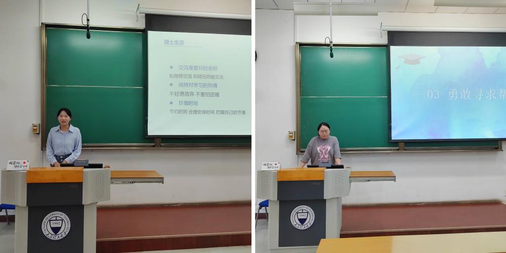 优秀学生代表王昕、王文斌同研究生新生进行了经验分享交流。交流会上,王昕分享了自己的科研生活,同时作为学姐,王昕希望2023级研究生能永葆学习热枕,不负青春韶华,努力在科研创新中谱写青春之歌;王文斌进行了以“逐光而行,行将致远”为主题的分享交流,她结合自身在院研究生会工作的经历经验,分享了自我收获与提升,并向同学们简单介绍了学院的各项活动,鼓励同学们积极参与到学院团学工作中来,在为同学服务中实现自我价值。