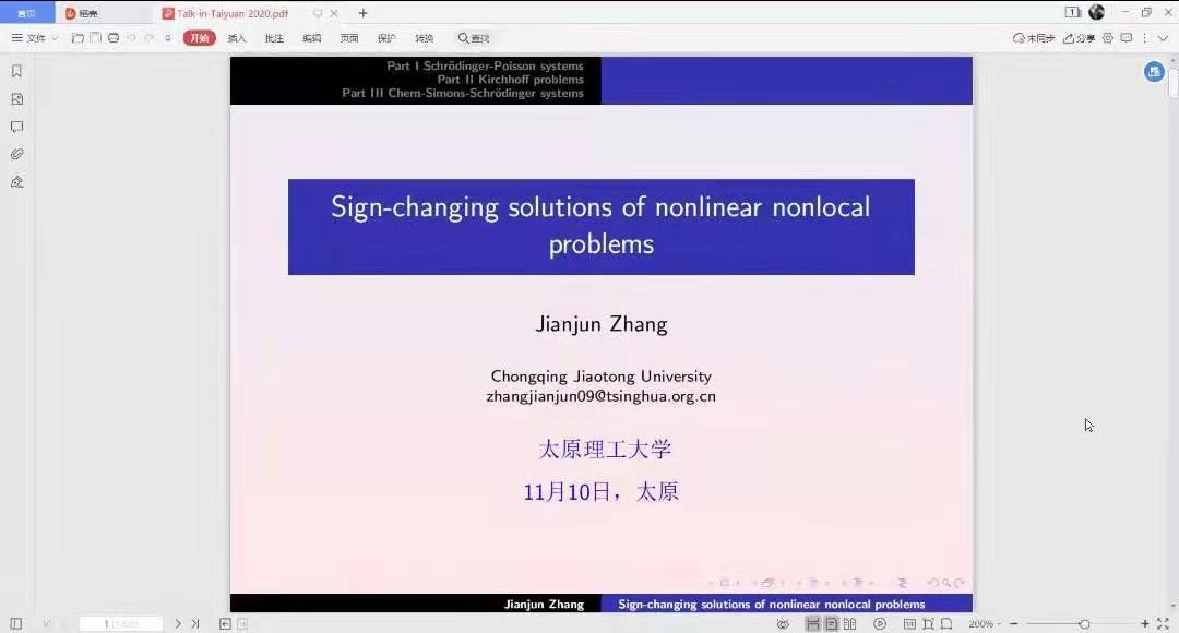 报告会上,张建军教授介绍了用下降流方法解决低阶增长的非局部型椭圆型方程包括Schrodinger-Poisson系统(3<p<4)、Kirchhoff型方程(2<p<4)以及gauged Schrodinger方程(4<p<6)无穷多径向变号解的研究成果,结合其近期的研究工作探讨了前人的变号临界点定理在处理非局部问题时的本质困难。讲座结束后,我院教师和同学与张建军教授进行了深入交流,并对张建军教授的精彩报告表示了由衷的感谢。