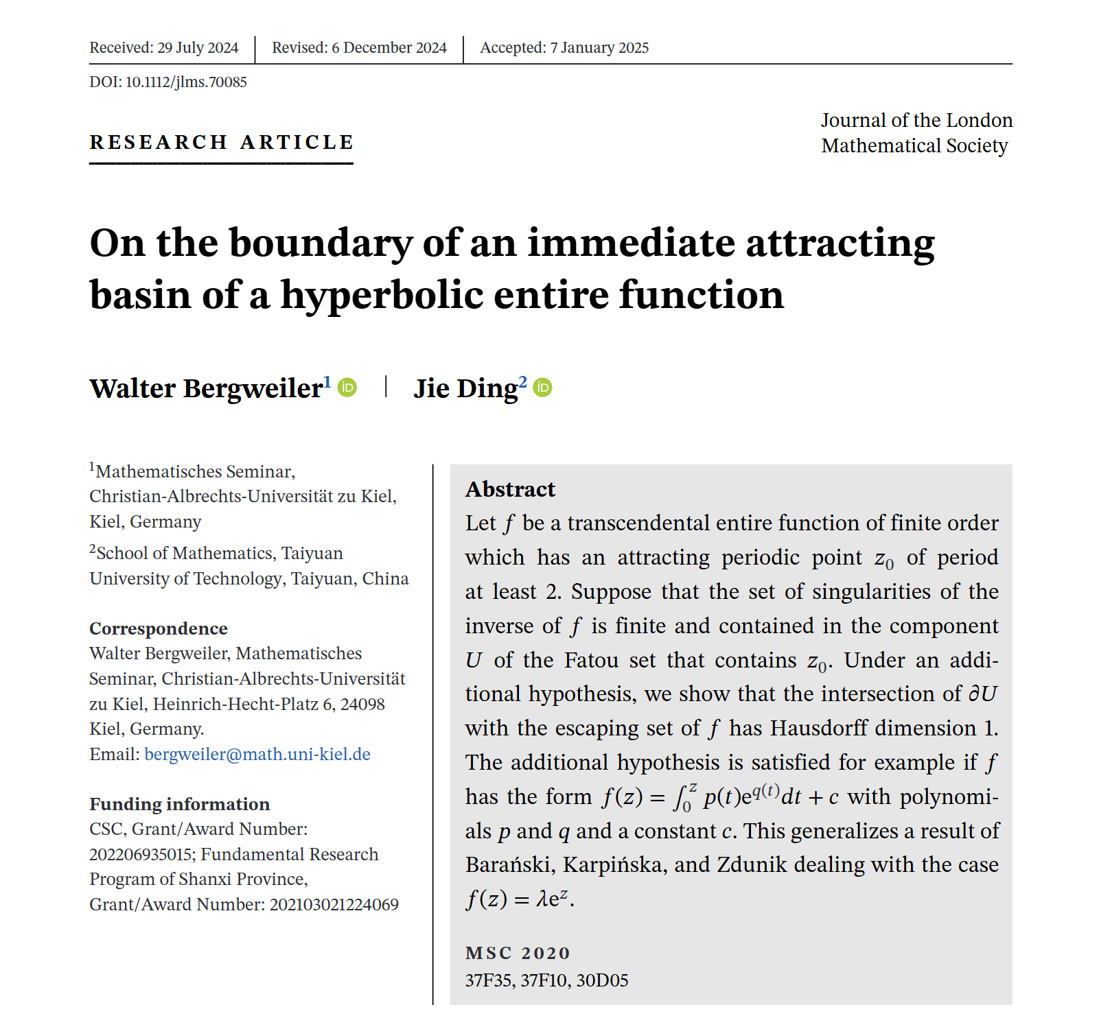 yl6809永利集团丁杰副教授与德国数学家Walter Bergweiler教授合作,在超越整函数动力系统领域取得研究进展。研究论文以“On the boundary of an immediate attracting basin of a hyperbolic entire function”为题,发表在数学领域一流国际学术期刊《Journal of the London Mathematical Society》,该期刊是数学领域“四大”期刊之外的最富声誉的国际著名期刊之一。两位合作者以姓氏字母顺序署名发表该文,以姓氏字母顺序署名是数学领域合作发表学术论文的国际惯例,中国数学会也发文呼吁国内单位广泛认同该惯例。